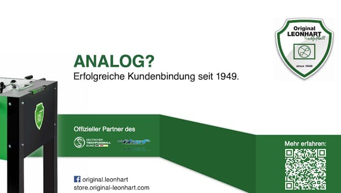 Wir haben mit einer Vielzahl an Präsenzveranstaltungen und Sponsorings bei und von Turnieren weltweit dafür gesorgt, dass sich unter den Kicker-Profis herumspricht, dass sich bei Original Leonhart ausschließlich erfahrene Tischkicker-Enthusiasten um die Produktion von Kickertischen kümmern. Und über unsere hochqualitative regional-Positionierung „made in Bavaria“ vereinen wir Leidenschaft, Know-how und jahrzehntelange Erfahrung im Kicker-Sport nachvollziehbar. Auch für Privatpersonen, non-Profis und Unternehmensinhaber. Unsere Mission, sich auf höchstem Niveau kontinuierlich weiterzuentwickeln und den Kunden ein Produkt zu präsentieren, das einen Wow-Effekt erzeugt, rundet alle kommunikativen Maßnahmen in den Bereichen Emotion, Fertigung, Design, Innovation und Vielfalt ab.